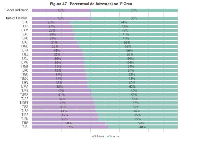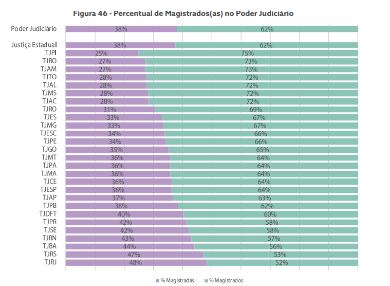 No Maranhão, segundo o Relatório Justiça em Números 2023, do Conselho Nacional de Justiça (CNJ), o judiciário maranhense é composto por 36% de mulheres contra 64% de homens.