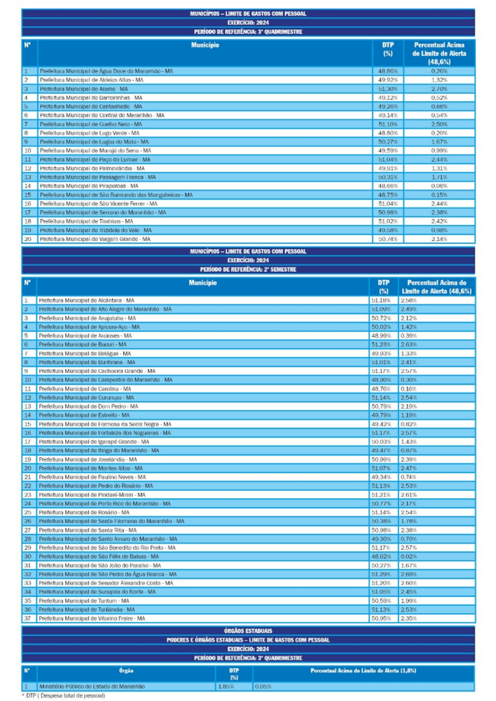 O Tribunal de Contas do Estado (TCE-MA), por meio de sua Secretaria de Fiscalização (Sefis) emitiu, na quinta-feira, 20, alerta a 37 prefeituras maranhenses que apresentaram situação desfavorável ou irregular no que diz respeito aos gastos de despesa de pessoal, apurados no 3º quadrimestre e do 2º semestre de 2024.