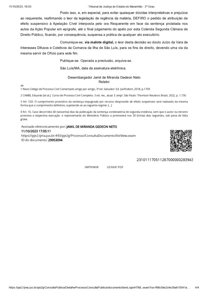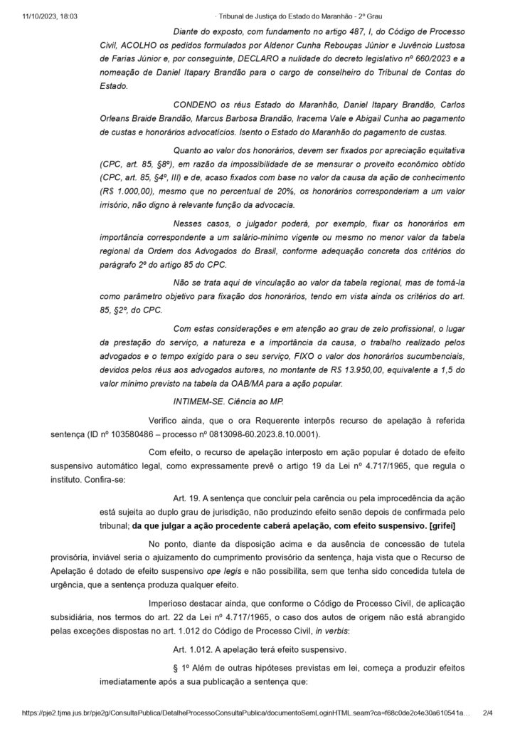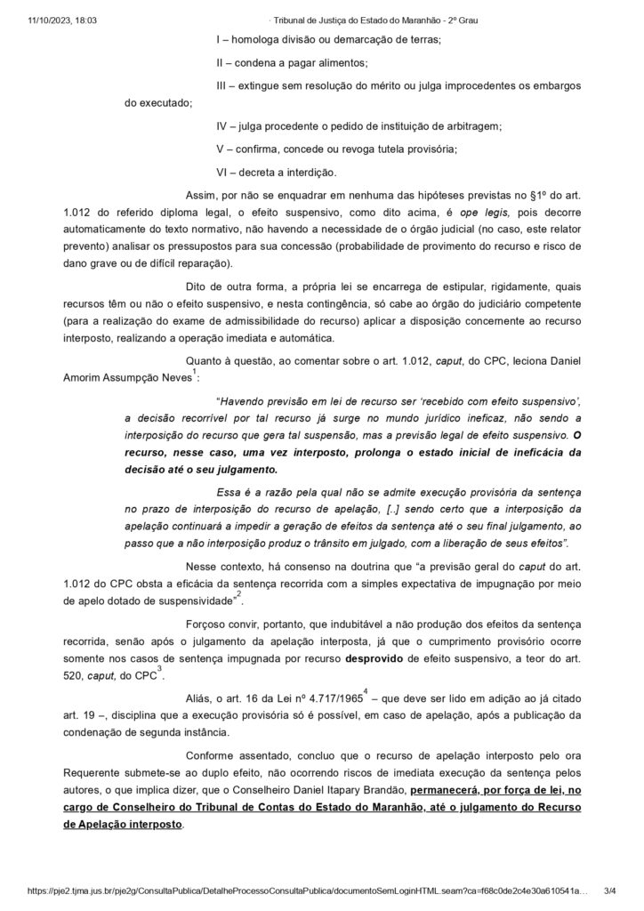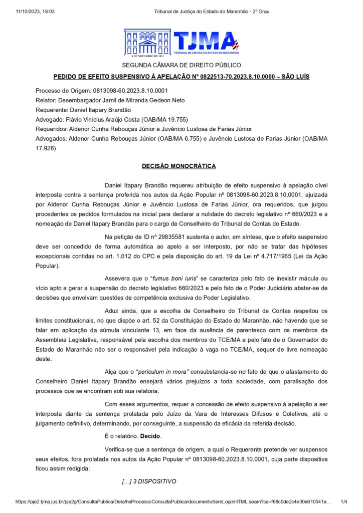 No despacho, o desembargador Jamil Gedon destaca que, com o efeito suspensivo aplicado a um recurso interposto pela defesa de Daniel Brandão, “o conselheiro […] permanecerá, por força de lei, no cargo de Conselheiro do Tribunal de Contas do Estado do Maranhão, até o julgamento do Recurso de Apelação interposto”.