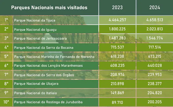Em 2024, o ranking dos Parques Nacionais mais visitados do Brasil reafirmou a consolidação do Parque Nacional da Tijuca (RJ), com mais de 4,6 milhões de visitas, do Parque Nacional do Iguaçu (PR), com mais de 2 milhões de visitas, e do Parque Nacional de Jericoacoara (CE), com mais de 1,5 milhão de visitas, no topo da lista. O quarto mais visitado foi o Parque Nacional da Serra da Bocaina, localizado na divisa entre os estados do Rio de Janeiro e São Paulo, com 717.414 visitas, seguido pelo Parque Nacional Marinho de Fernando de Noronha, com 673.215 visitas. Sexto colocado do ranking, o Parque Nacional dos Lençóis Maranhenses, que em julho do ano passado foi reconhecido pela UNESCO como Patrimônio Natural da Humanidade, recebeu 440.028 visitantes, aumento significativo em comparação com 2023, quando foram contabilizadas 408.235 visitas.