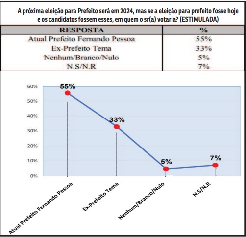 No levantamento feito com 400 pessoas maiores de 16 anos de idade, residentes e com domicílio eleitoral na cidade, 55% disseram que votariam em Fernando Pessoa contra 33% que manifestaram desejo em votar para Cleomar Tema (ex-prefeito). A consulta apontou ainda que 5% votariam em nenhum ou branco/nulo e 7% não sabe ou não respondeu.
