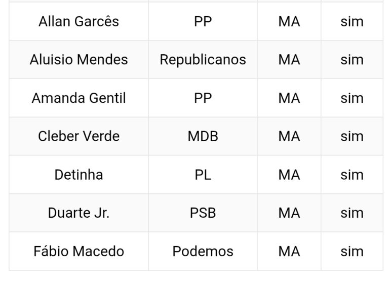 Da bancada do Maranhão, segundo levantamento do Poder 360, dos 18 deputados na Casa, 12 manifestaram-se a favor do texto, e apenas o deputado Márcio Jerry (PCdoB) foi contra. Outros cinco parlamentares não votaram.