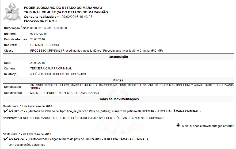 No Tribunal de Justiça, o relator do processo é o desembargador José Joaquim Figueiredo dos Anjos. Diferente da Comarca de Santa Rita que a tramitação está parada desde janeiro, no TJ a última movimentação do processo foi no dia 18 de fevereiro, com a juntada de certidões de antecedentes criminais dos envolvidos.
