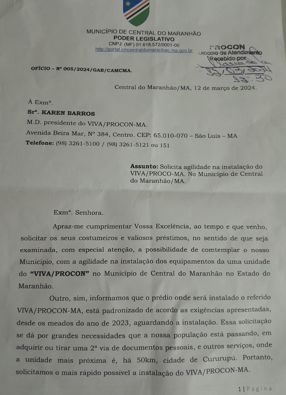 Pensando nisso, o chefe do Legislativo esteve em São Luís, nesta quarta-feira, 13, para protocolar oficio pedindo ao Governo do Maranhão, por meio do VIVA/Instituto de Promoção e Defesa do Cidadão e Consumidor do Maranhão (Procon/MA), mais agilidade na instalação da unidade no município.