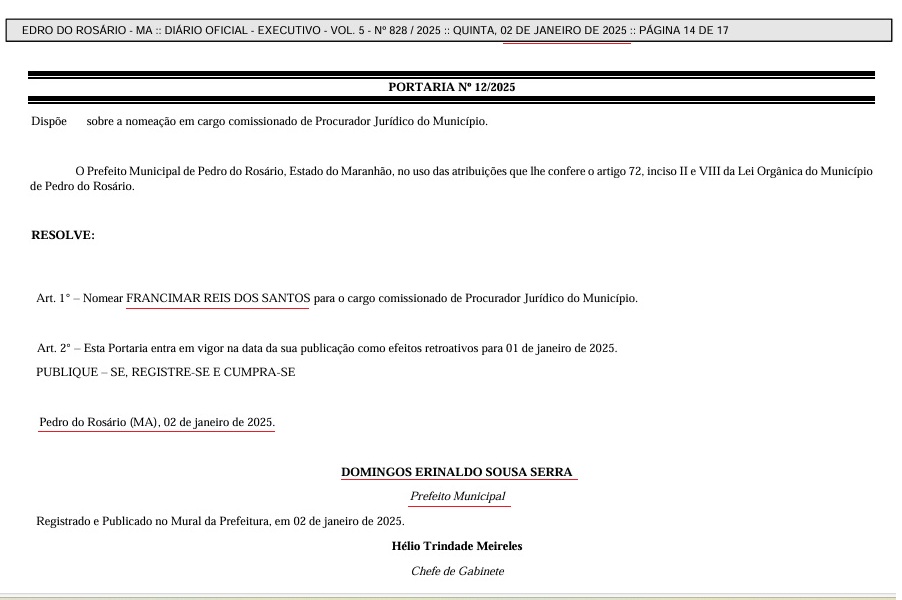 De acordo com ato publicado no Diário Oficial do Município (DOM), o causídico foi nomeado como procurador da cidade pedrorosariense em 2 de janeiro deste ano. A portaria nº 12/2025 foi assinada pelo prefeito Toca Serra (PCdoB), sendo subscrita pelo Chefe de Gabinete, Hélio Trindade Meireles.