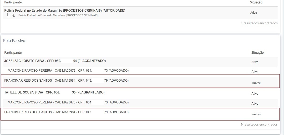 O auto de prisão em flagrante tramita na 1ª Vara Criminal Federal. Contudo, no sistema Processo Judicial Eletrônico (PJe) do Tribunal Regional Federal da 1ª Região (TRF1), o status do defensor já é exibido como ‘inativo’, conforme dados em anexo.