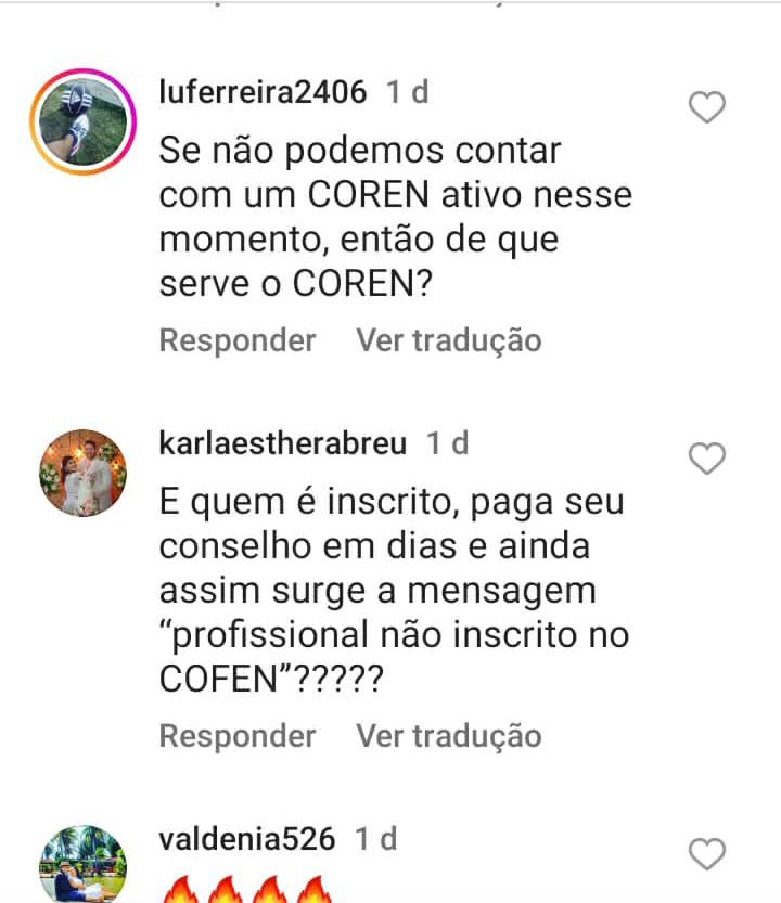 Karla Esther Abreu também se manifestou nas redes sociais, perguntando: “E quem está inscrito, paga seu conselho em dia e ainda surge a mensagem: ‘profissional não inscrito no COFEN’?”