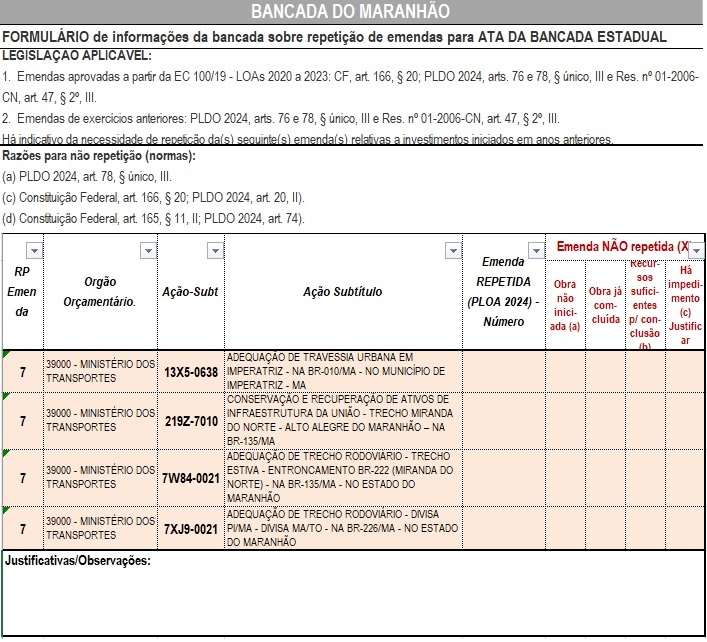 Também estão na relação a adequação de trecho rodoviário – trecho estiva – entroncamento BR-222 (Miranda do Norte) – na BR-135; e a adequação de trecho rodoviário – divisa PI/MA – divisa MA/TO – na BR-226/MA.