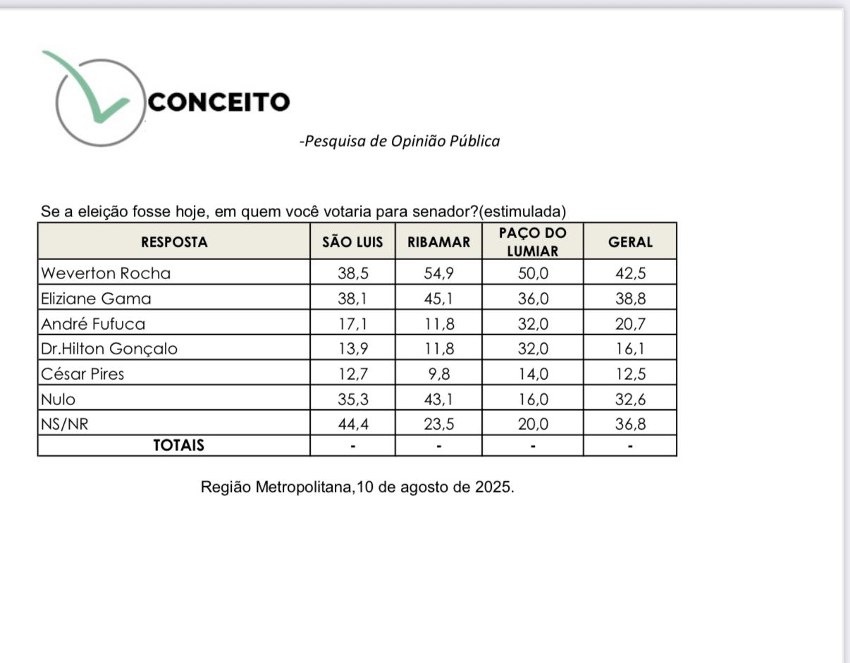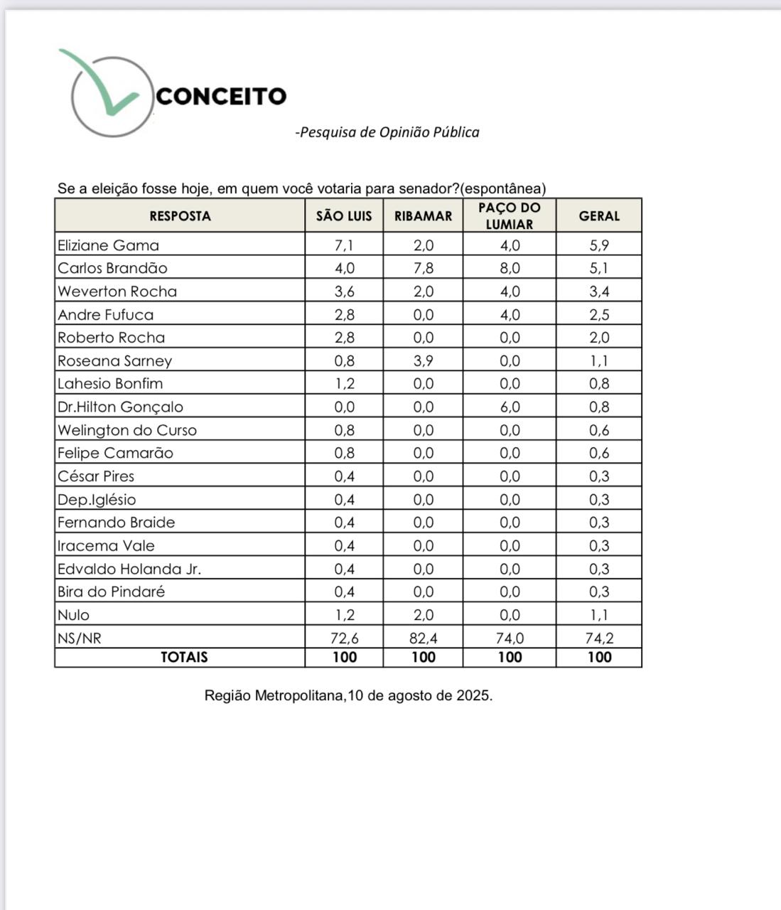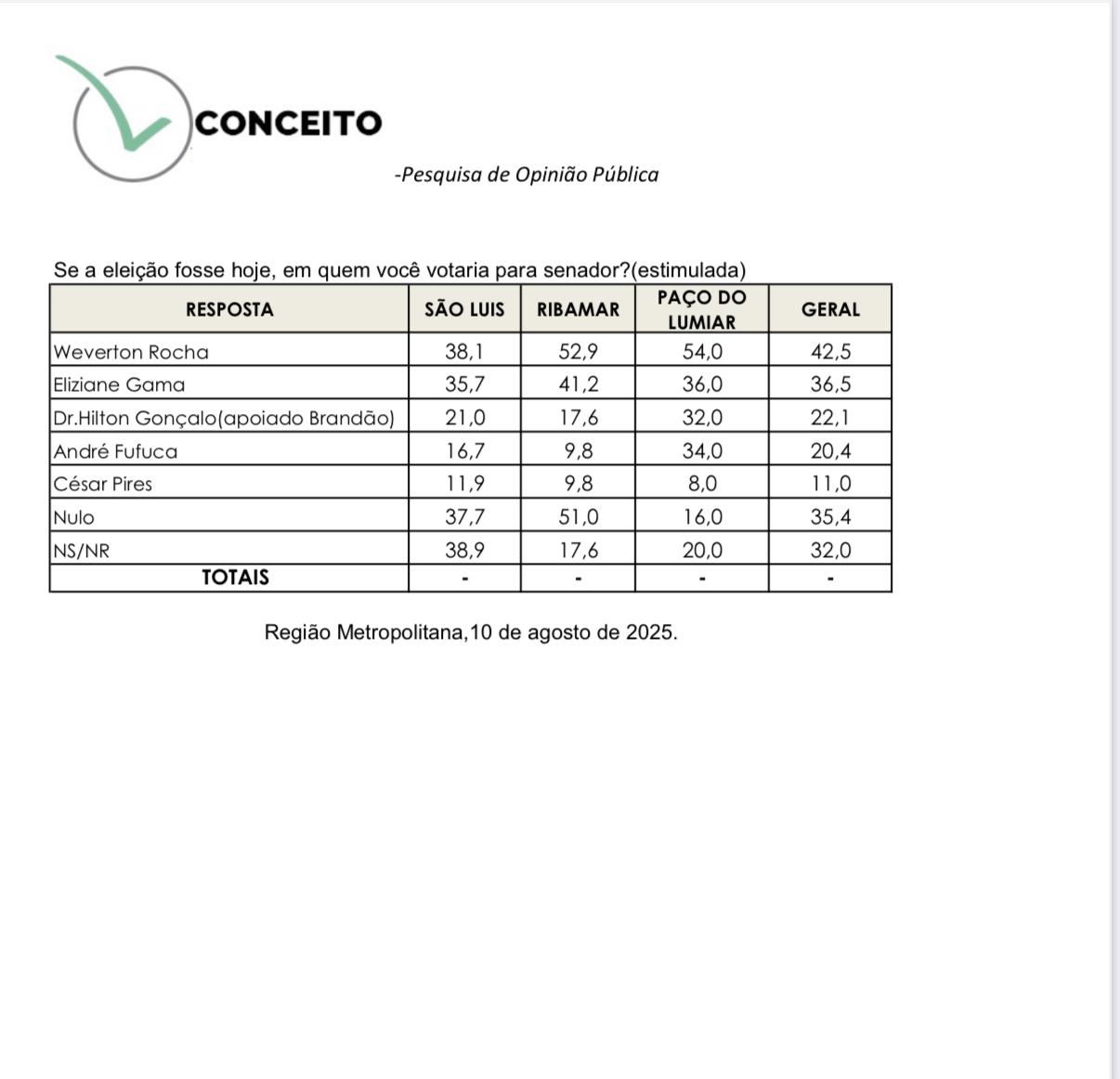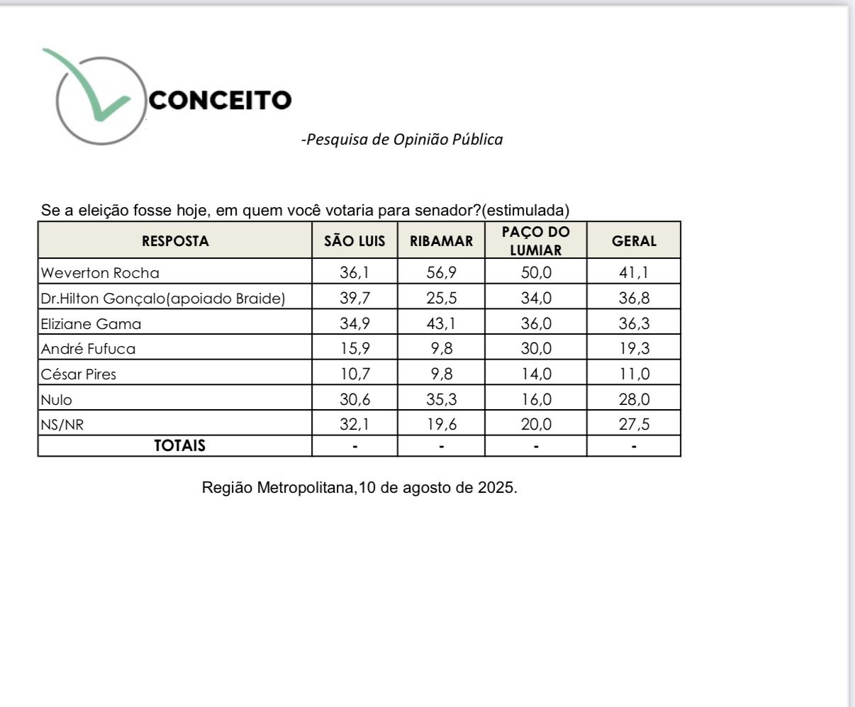 O Instituto Conceito realizou um estudo sobre a intenção de votos para avaliar o efeito do prefeito de São Luís, Eduardo Braide (PSD), e do governador Carlos Brandão (PSB) como agentes influenciadores na disputa pelo Senado nas eleições de 2026 nos municípios de São José de Ribamar, Paço do Lumiar e na capital maranhense.