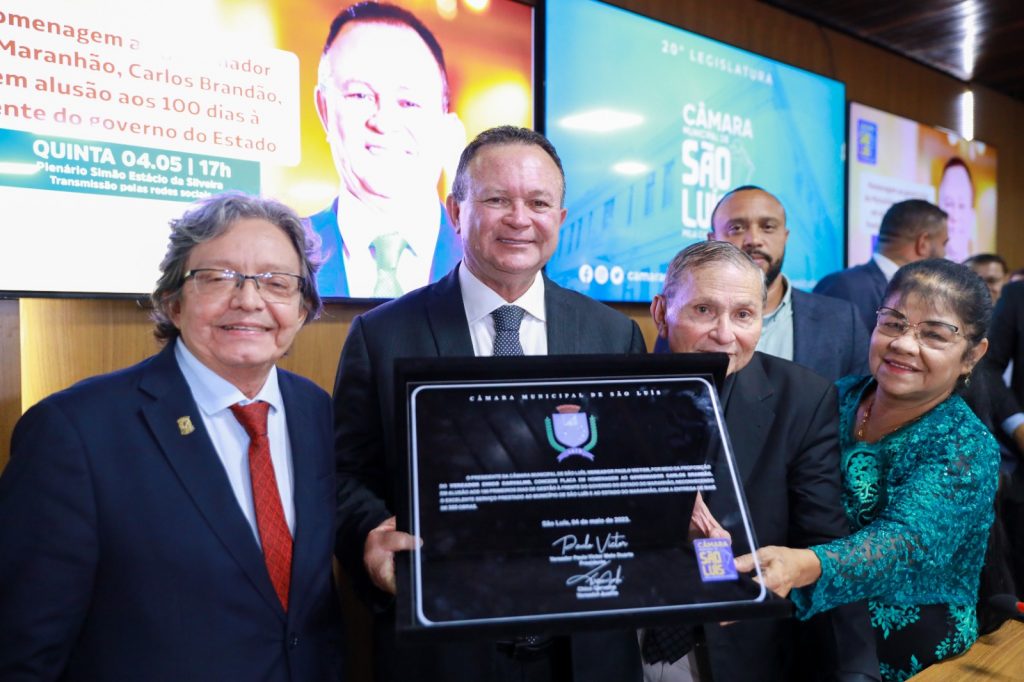 A Câmara Municipal de São Luís (CMSL) realizou, na tarde desta quinta-feira (4), uma solenidade em homenagem ao governador Carlos Brandão (PSB) pelos 100 dias do novo governo. A cerimônia ocorreu no Plenário Simão Estácio da Silveira e foi presidida pelo presidente da Casa, vereador Paulo Victor (PCdoB). A propositura do evento foi de autoria do vereador Chico Carvalho (Avante).