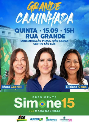 “Venha caminhar conosco na Rua Grande, Centro de São Luís-MA nesta quinta-feira, dia 15, ao lado de Simone Tebet e Mara Gabrilli”, convidou Eliziane, que chegou a ter seu nome cotada para vice na chapa.