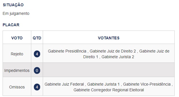 Faltam votar ainda o desembargador José Gonçalo Filho, corregedor eleitoral; e os juízes Lino Serra Sousa Segundo e Amanda Waquim.