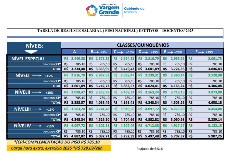 O desrespeito à lei nacional, segundo ficou constatado, se dá porque nenhuma das tabelas com vencimento inicial das carreiras começa com o piso nacional, hoje definido em R$ 4.867,77, conforme Portaria Nº 77/2025 que estabeleceu valor mínimo para o exercício de 2025 da rede pública de todo o país, com jornada de 40 horas semanais. Clique aqui e confira a íntegra da Portaria.