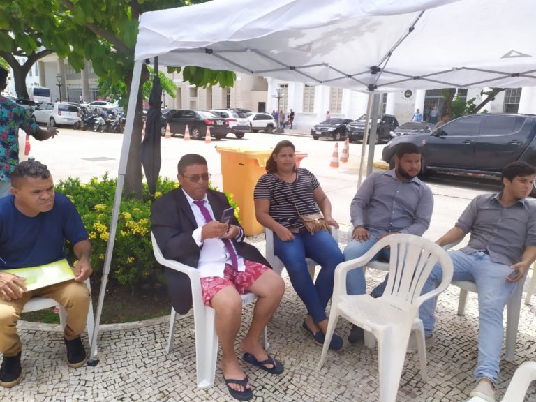 Para demonstrar que é vereador “pela metade”, Sá Marques ficou de terno e gravata, mas de calção e chinelo acampado em frente à prefeitura de São Luís.