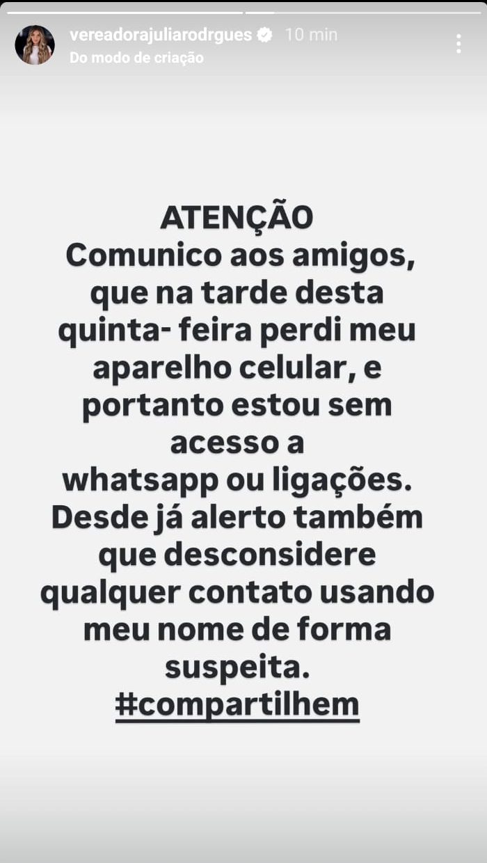 A presidente da Câmara de Afonso Cunha, vereadora Júlia Maria Rodrigues Silva, que acusou o vice-prefeito Floriano Pereira da Costa, por tentativa de estupro, injúria e lesão corporal, afirmou nesta quinta-feira (28) que perdeu o celular e estava impossibilitada de usar o WhatsApp ou receber chamadas. Por meio de um comunicado publicado nas redes sociais, a parlamentar solicitou aos amigos e seguidores que ignorassem qualquer mensagem duvidosa que mencionasse seu nome.
