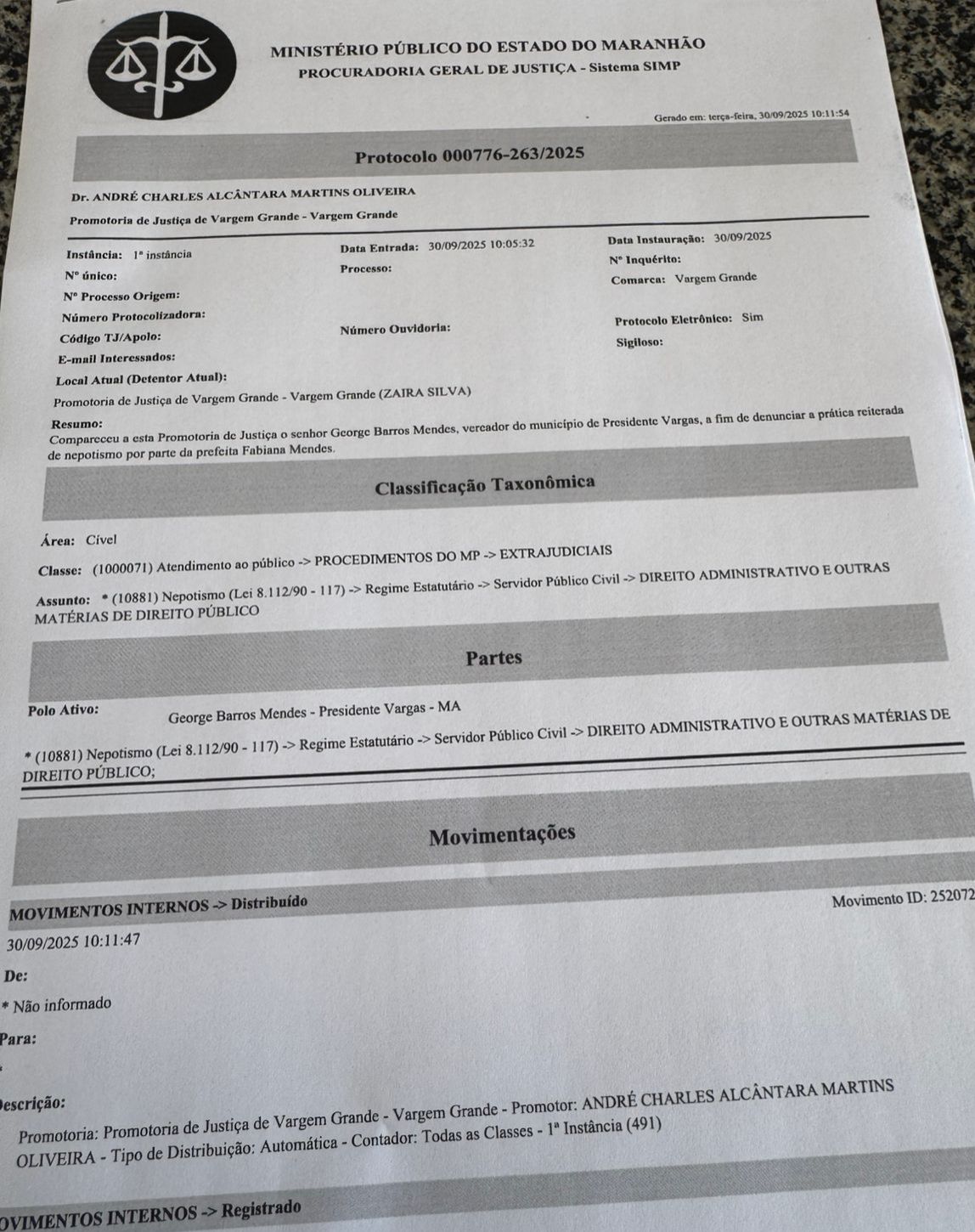 A denúncia apresentada à Promotoria de Justiça da Comarca de Vargem Grande foi assinada pelos cinco vereadores opositores. O vereador George Barros (PL), acionado pela prefeita para ser proibido de exercer a própria função, foi um dos parlamentares que assinou a peça.